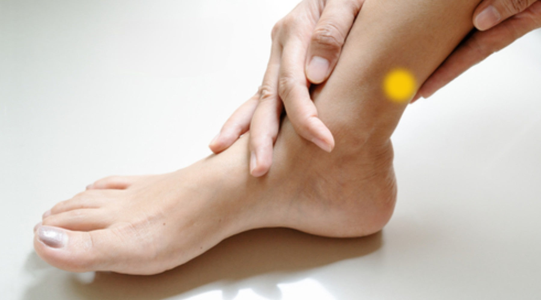 Find the pressure point on the inside of the ankle just above the heelbone. Press and massage upwards along the inside of the Achilles tendon. Do this lightly and rhythmically.