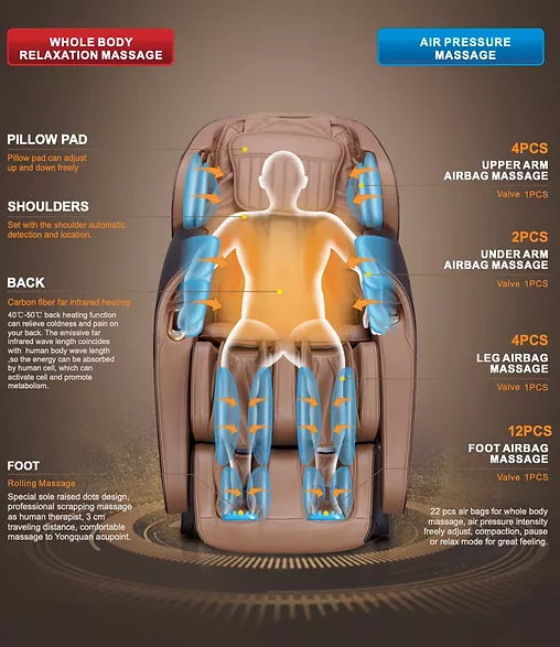 With features like automatic shoulder width detection and body scanning, the chair ensures that each massage is effective and precise. Additionally, the foot scraping Gua Sha massage focuses on acupressure points on the soles of the feet to alleviate pain and discomfort.